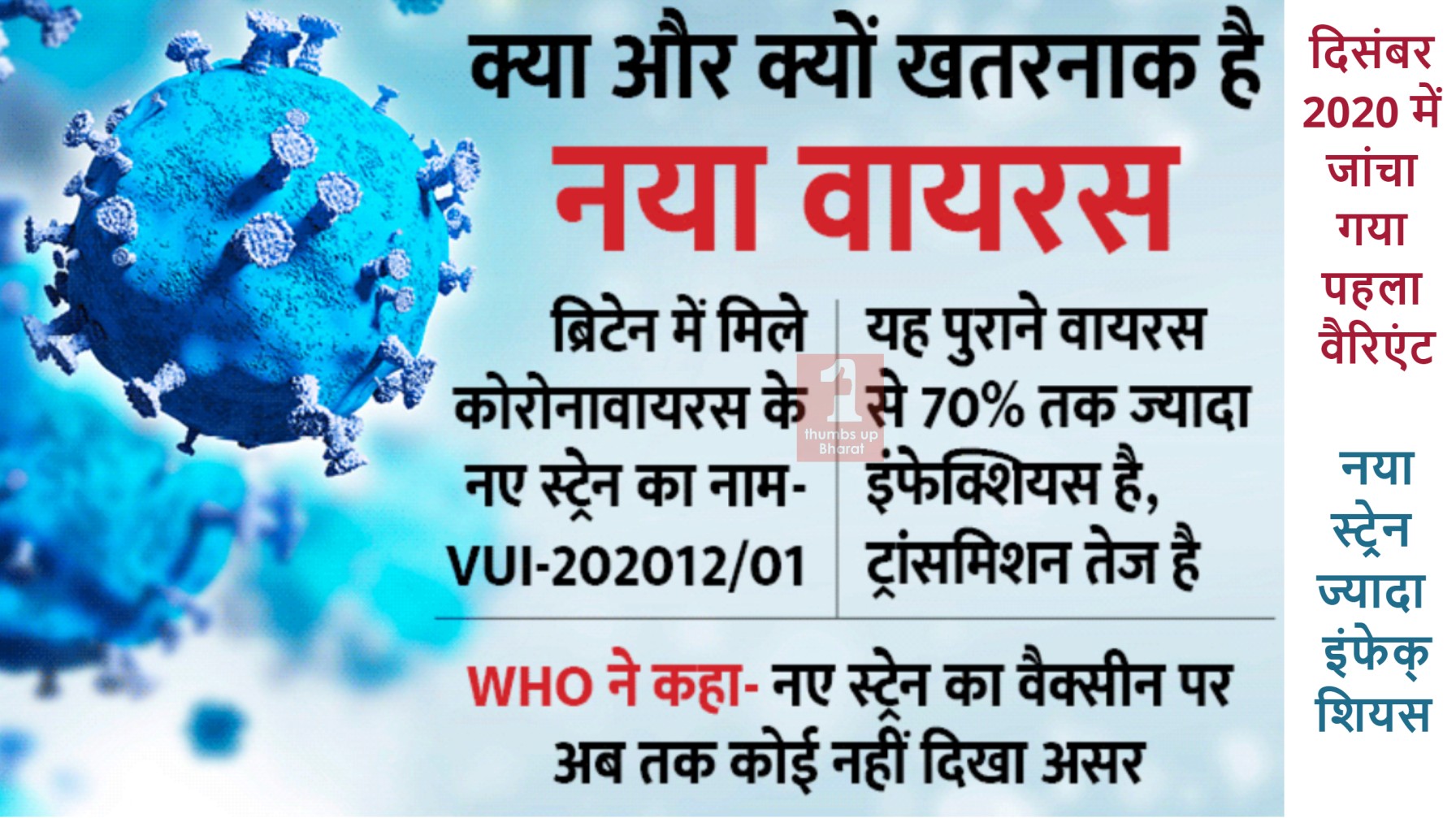 कोरोनावायरस ने अपना स्वरूप बदल दिया है। यह नया वेरिएंट VUI-202012/01 (दिसंबर 2020 में पहला वेरिएंट टेस्ट किया गया) पहले से ज्यादा खतरनाक है। यह ज्ञात नहीं है कि यह मामले को खराब कर सकता है या मौत का कारण बन सकता है, लेकिन यह पता चला है कि नया तनाव अधिक अप्रभावी है। इसकी संचरण दर पहले की तुलना में 70% अधिक है।