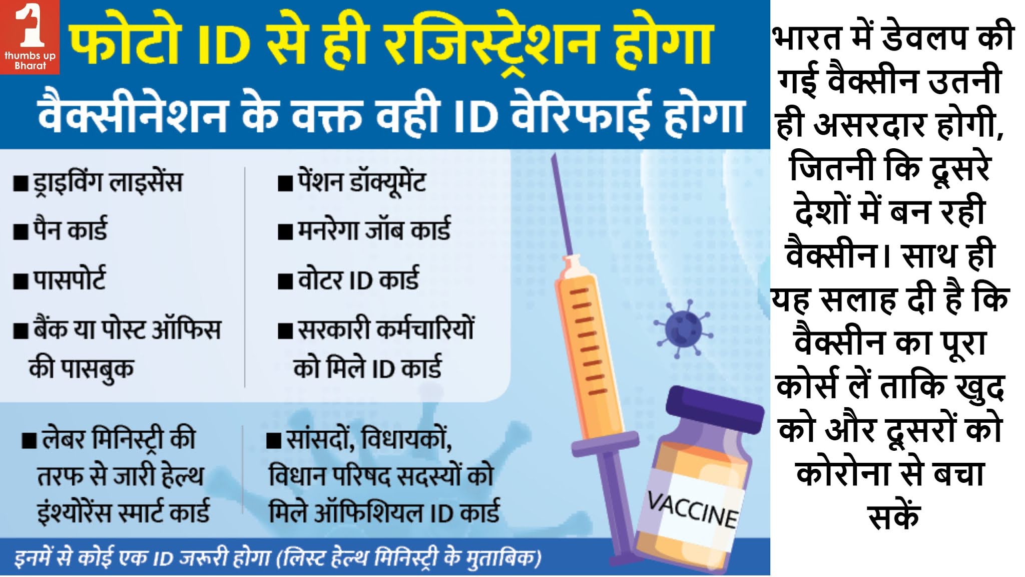 पंजीकरण के समय फोटो आईडी की आवश्यकता होगी। टीकाकरण के समय इसका सत्यापन किया जाएगा।