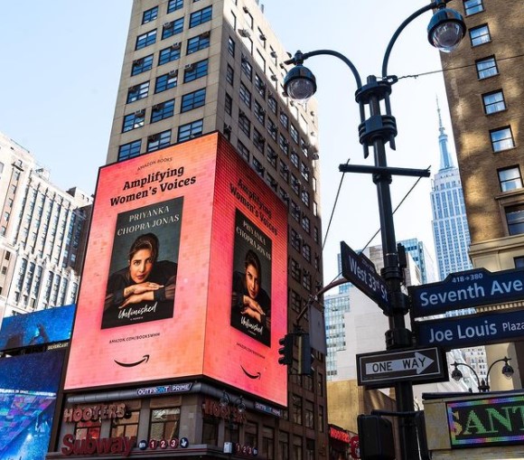 प्रियंका चोपड़ा ने एक महीने पहले 9 फरवरी को अपनी मेमॉयर ‘Unfinished’ लॉन्च  की थी। इस किताब में प्रियंका ने अपने निजी और पेशेवर जीवन से जुड़ी कई बातें साझा की हैं। फैंस प्रियंका की किताब ‘Unfinished’ को काफी पसंद कर रहे हैं। मंगलवार को प्रियंका ने सोशल मीडिया पर एक फोटो शेयर की है। इस फोटो में उनकी किताब ‘अनफिनिश्ड’ का कवर पोस्टर न्यूयॉर्क शहर में 6-स्टोरी बिलबोर्ड पर दिखाई दे रहा है। इस पर प्रियंका ने खुशी जाहिर की।