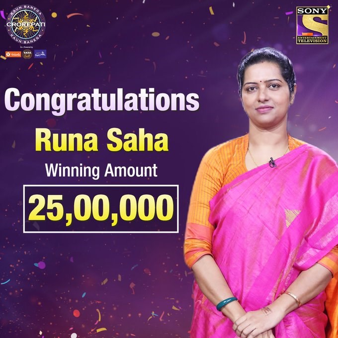 Congratulations RUNA SAHA for winning ₹25,00,000 on #KBC12. Keep watching #KBC12 Mon- Fri 9 PM only on Sony TV @amitabhbachchan @spnstudionext pic.twitter.com/UBsgMvalQb