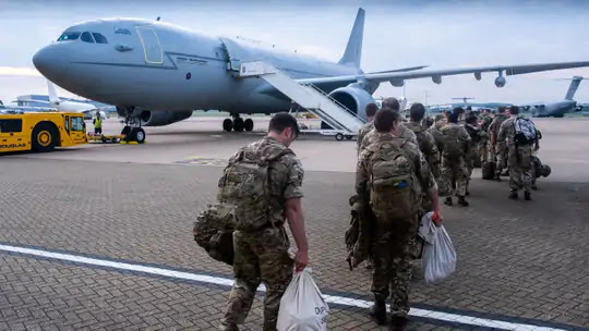 | अफगानिस्तान में लंबी तैनाती के बाद वापस लौटते हुए अमेरिकी फोर्स के सैनिक। |