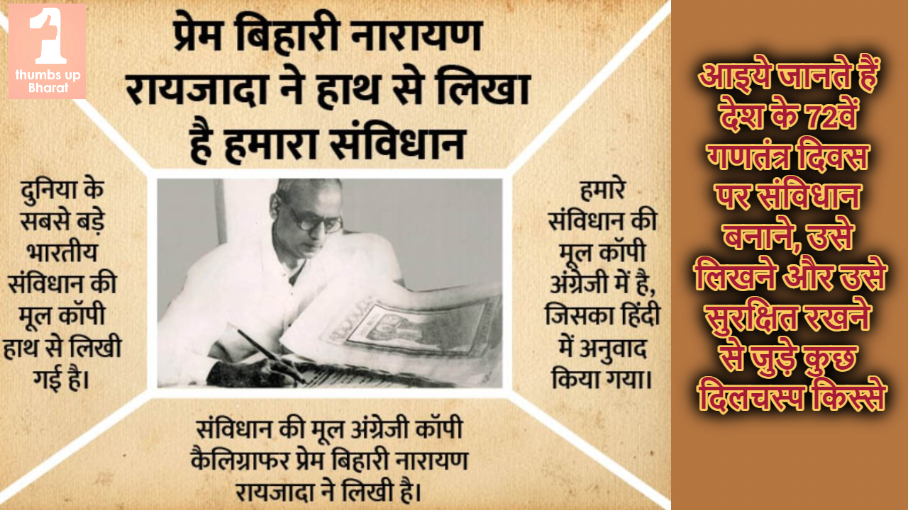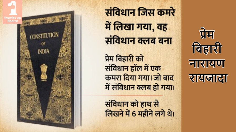 क्या आप जानते हैं कि हमारा संविधान किसने लिखा है? इस सवाल का जवाब डॉ. बीआर अंबेडकर नहीं, बल्कि प्रेम बिहारी नारायण रायज़ादा हैं। जी बिल्कुल, डॉ. अंबेडकर को संविधान सभा की ड्राफ्टिंग सभा का अध्यक्ष होने के नाते संविधान निर्माता होने का श्रेय दिया जाता है, लेकिन प्रेम बिहारी वह व्यक्ति हैं जिन्होंने संविधान की मूल प्रति अपने हाथ से अंग्रेजी में लिखी थी। इस काम में उन्हें 6 महीने लगे और कुल 432 निब का इस्तेमला हुआ। हमारा संविधान केवल हाथ से नहीं लिखा गया है, बल्कि शांति निकेतन के चित्रकारों ने इसके कवर से लेकर इसकी खूबसूरत कला तक हर पृष्ठ को सजाया है।
