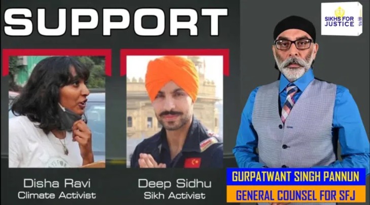 खालिस्तानी आतंकवादी संगठन सिख फॉर जस्टिस ( SFJ ) ने बुधवार को क्लाइमेट एक्टिविस्ट दिशा रवि और पंजाबी गायक दीप सिद्धू के समर्थन में वेबसाइट लॉन्च की। संगठन के गुरपवंत सिंह पन्नू ने कहा कि एसजेएफ ने दिशा रवि, निकिता जैकब, शांतनु और दीप सिद्धू के समर्थन में एक वेबसाइट शुरू की है। इसका नाम Twitter4Farmer (डॉट) इन है।