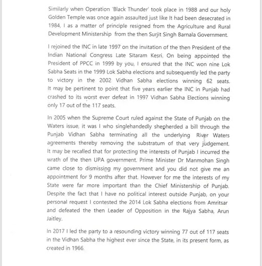 कांग्रेस अध्यक्ष सोनिया गांधी को भेजे गए अपने 7 पन्नों के त्याग पत्र में उन्होंने अपने पूरे राजनीतिक सफर का जिक्र किया है. अमरिंदर ने कांग्रेस आलाकमान के साथ नवजोत सिद्धू पर भी सवाल उठाए।