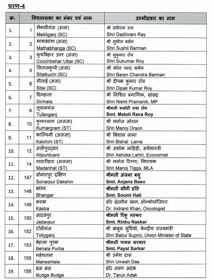 भाजपा ने तीन विधायकों को भी मैदान में उतारा है जो टीएमसी से टिकट नहीं मिलने के बाद टीएमसी से पार्टी में आए थे। इनमें से, 89 वर्षीय रवींद्रनाथ भट्टाचार्य, डोमजूर से राजीब बनर्जी और उत्तरपारा से प्रबीर घोषाल को भाजपा ने सिंगूर सीट से मैदान में उतारा है। ये सभी सीटें तीसरे और चौथे चरण में शामिल हैं।