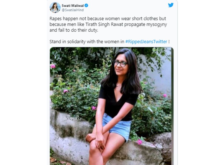 दिल्ली महिला आयोग की अध्यक्ष स्वाति मालीवाल ने एक तस्वीर ट्वीट की। उन्होंने उसके साथ टिप्पणी भी की है। लिखा है कि बलात्कार इसलिए नहीं किया जाता क्योंकि महिलाएं छोटे कपड़े पहनती हैं, बल्कि तीरथ सिंह रावत (Tirath Singh Rawat) जैसे लोग अपनी ड्यूटी नहीं करते हैं, इसलिए उनका बलात्कार किया जाता है।