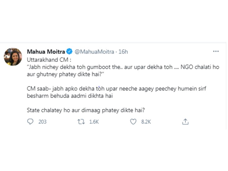 टीएमसी सांसद महुआ मोइत्रा ने भी अपने बयान के लिए सीएम रावत पर कटाक्ष किया है। उन्होंने एक के बाद एक लगातार दो ट्वीट किए।