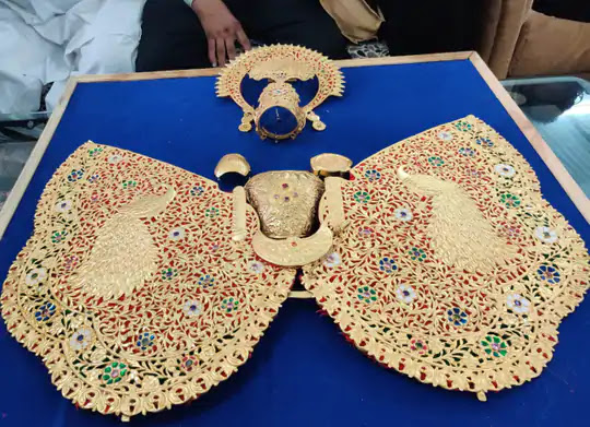 भेंट की गई स्वर्ण पॉलिश की हुई चांदी की पोशाक से ठाकुर जी को सजाया गया