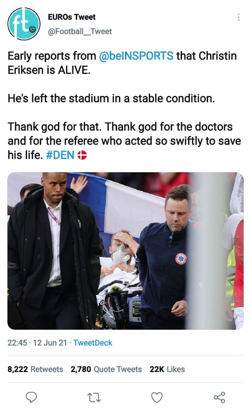 डेनिश फुटबॉल महासंघ ने भी कहा है कि Christian Eriksen ठीक है। ऑस्ट्रेलियाई खिलाड़ी ओलिवर ब्राउन ने सोशल मीडिया पर एक अपडेट दिया है। एरिक्सन को मेडिकल टेस्ट के लिए अस्पताल ले जाया गया है।