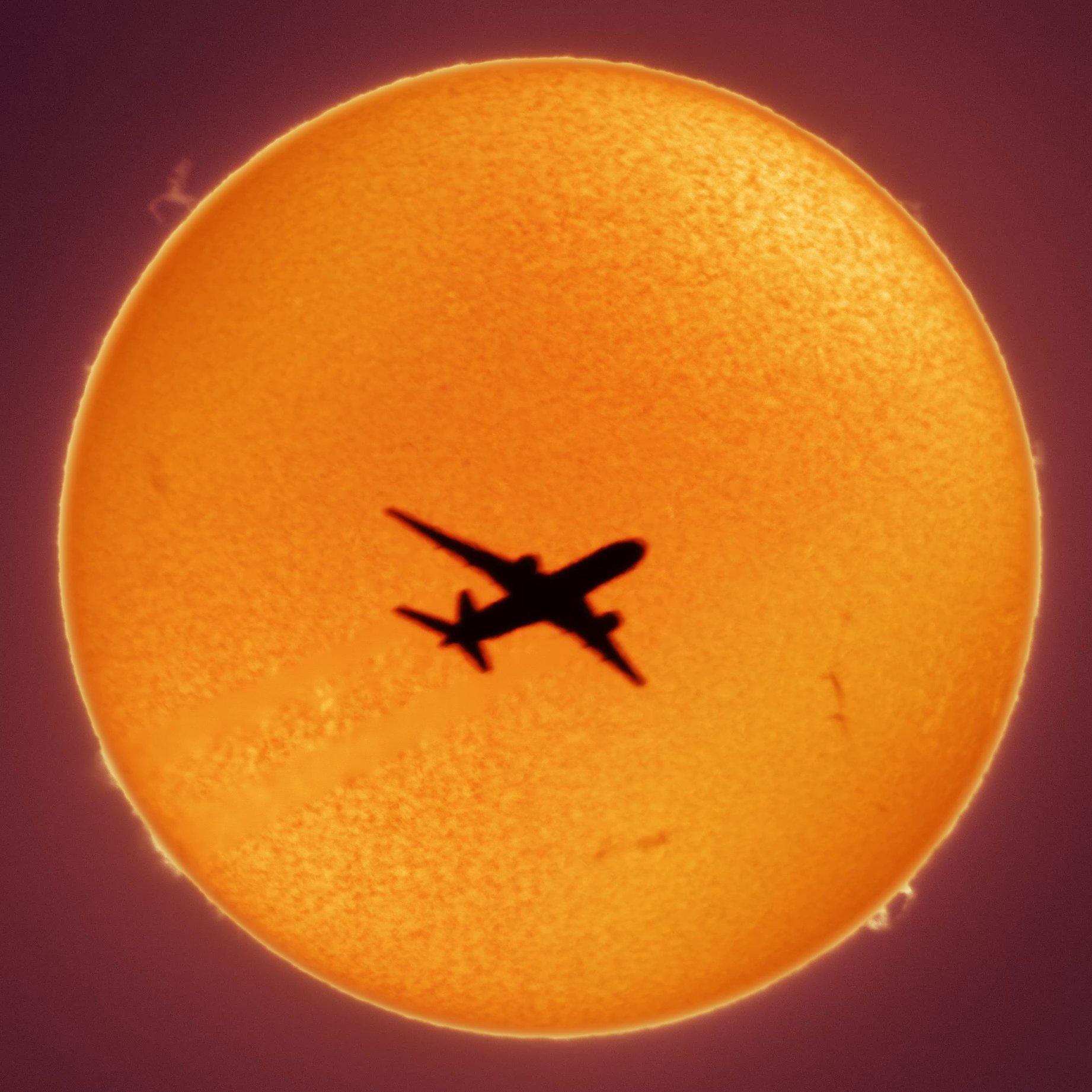 कैलिफोर्निया के फोटोग्राफर एंड्रयू मैककार्थी ने सूरज के साथ विमान की एक दुर्लभ तस्वीर ली है। विमान तब गुजर गया जब एंड्रयू हाइड्रोजन अल्फा सोलर फिल्टर से लगे टेलीस्कोप से सूर्य की बाहरी परत की तस्वीरें ले रहा था। विमान यूनाइटेड एयरलाइंस का था, जो न्यू जर्सी में उड़ान भर चुका है और कुछ सेकंड के लिए सूरज के सामने से गुजरा।