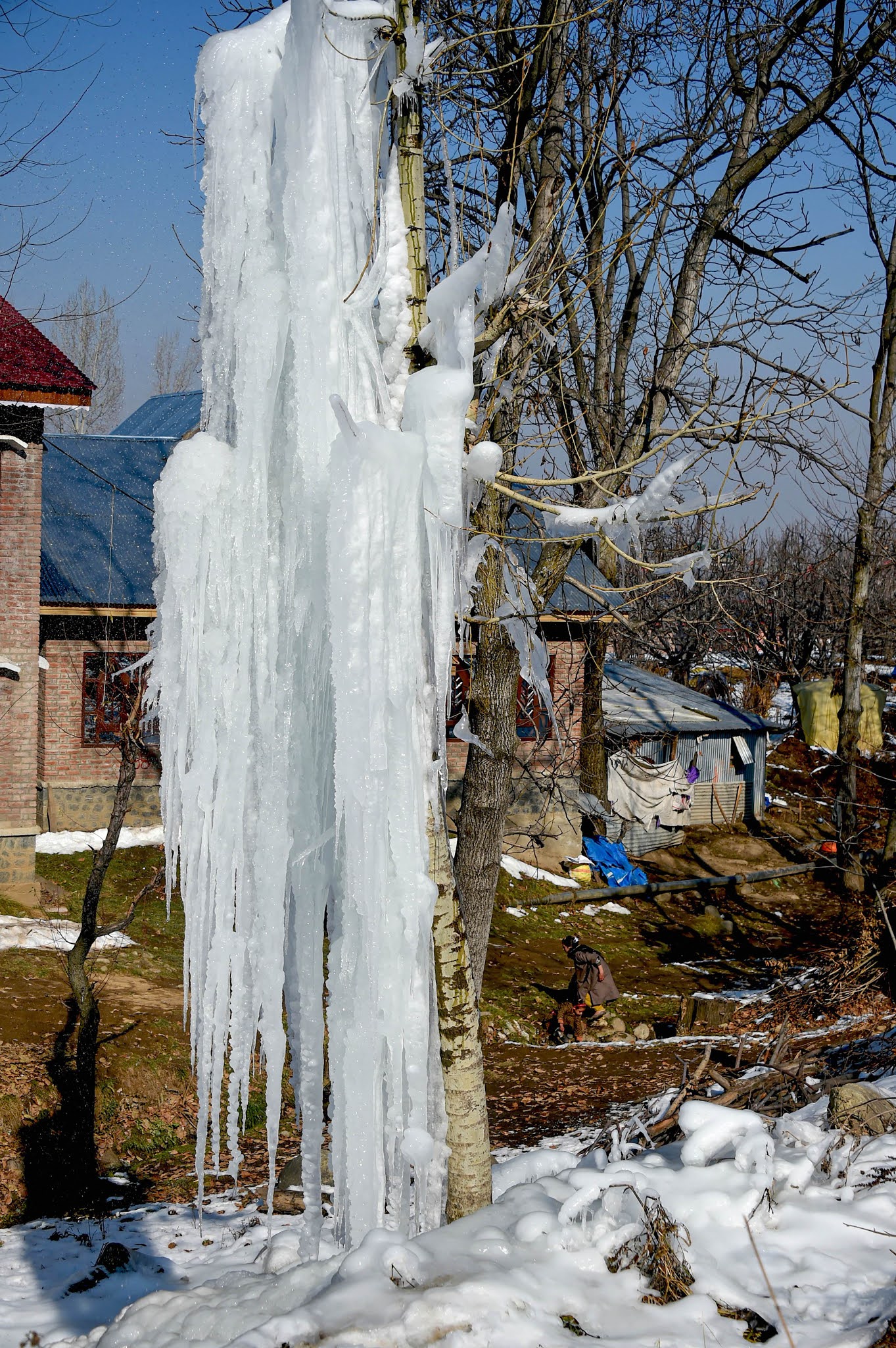 | कश्मीर के शोपियां में पाइप लाइन फटने से निकला पानी पेड़ पर ही जम गया |